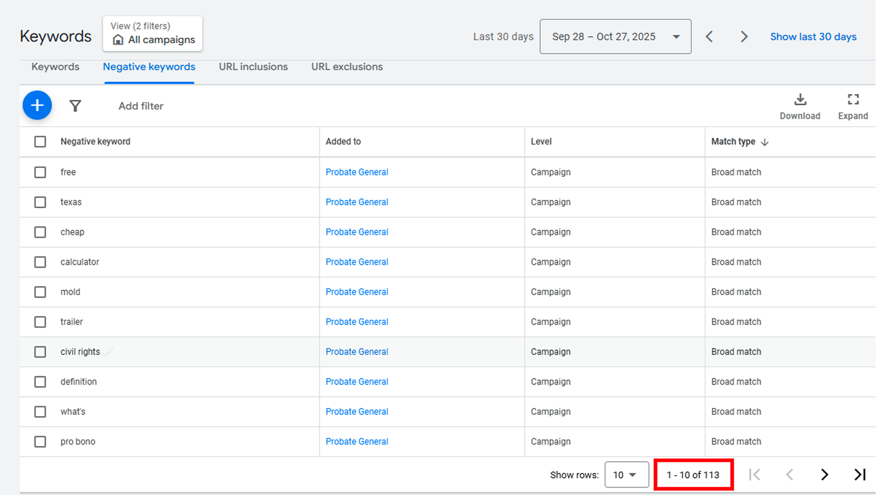 Negative Keywords Layering: Frequent, systematic updates to negative keyword lists ensured ad budget was protected from irrelevant, low-quality traffic. We increased the negative keyword list to 113, including broad-match negatives for free or irrelevant legal work, informational queries, and out-of-state searches.