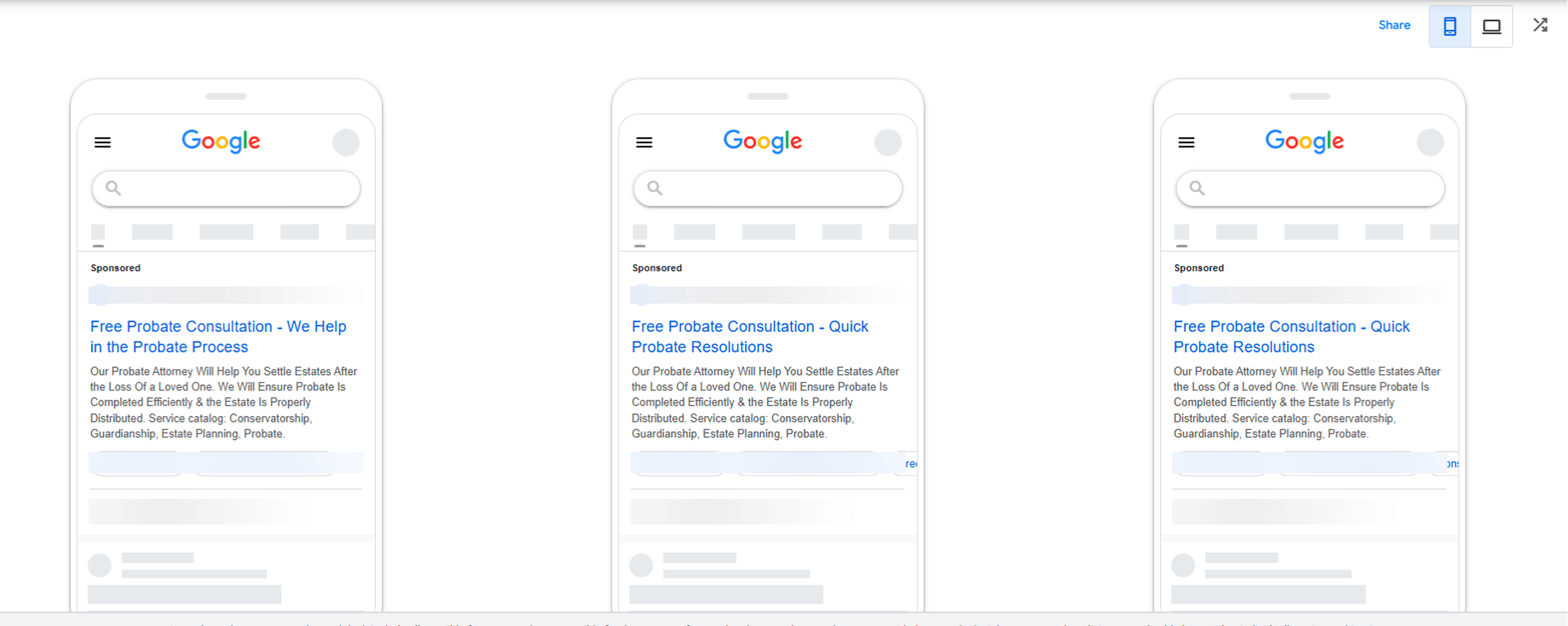 In this version, the offer “Free Probate Consultation” is pinned as the first headline: