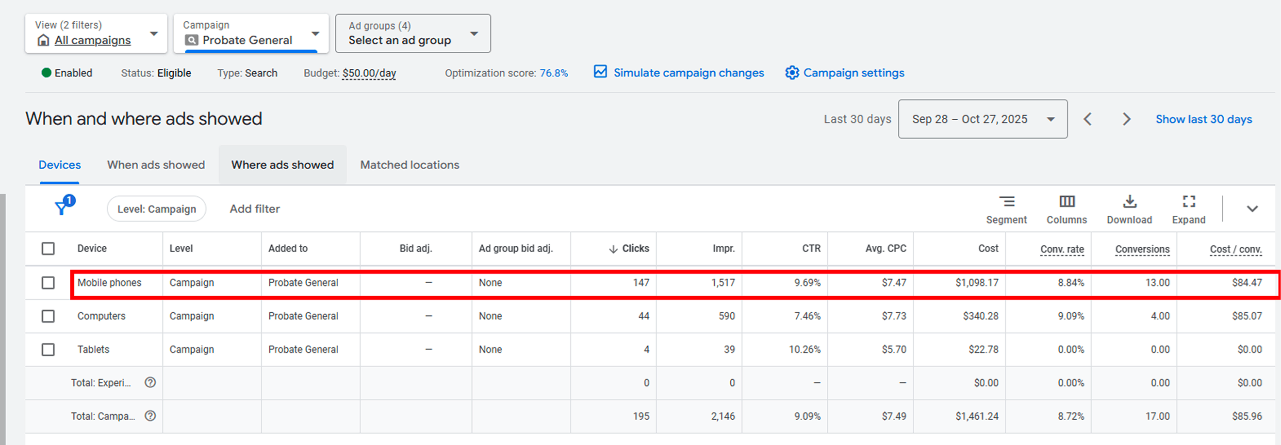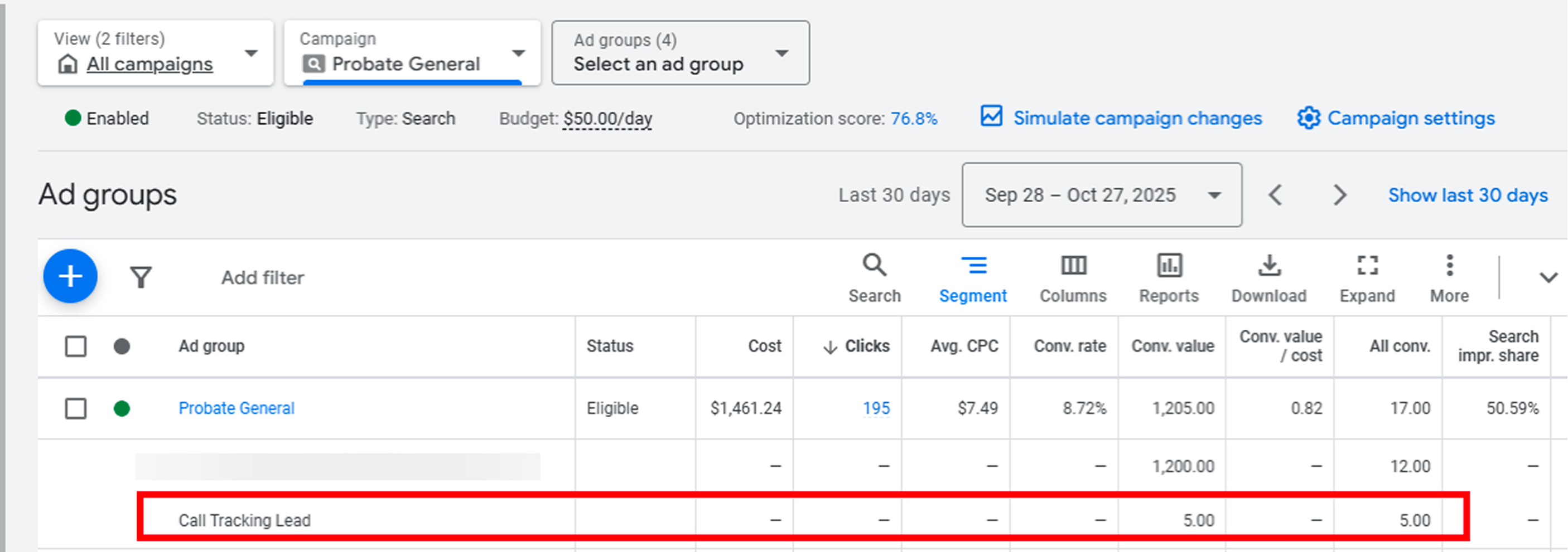 A probate law firm’s Google Ads account appeared to generate 8 conversions per month on approximately $600 in ad spend, but nearly all leads were spam submissions from Google’s Search Partner Network. The account had a bloated keyword list (69 of 79 keywords had never converted), deprecated ad types still running, Search Partners and Display turned on, and no phone call tracking.