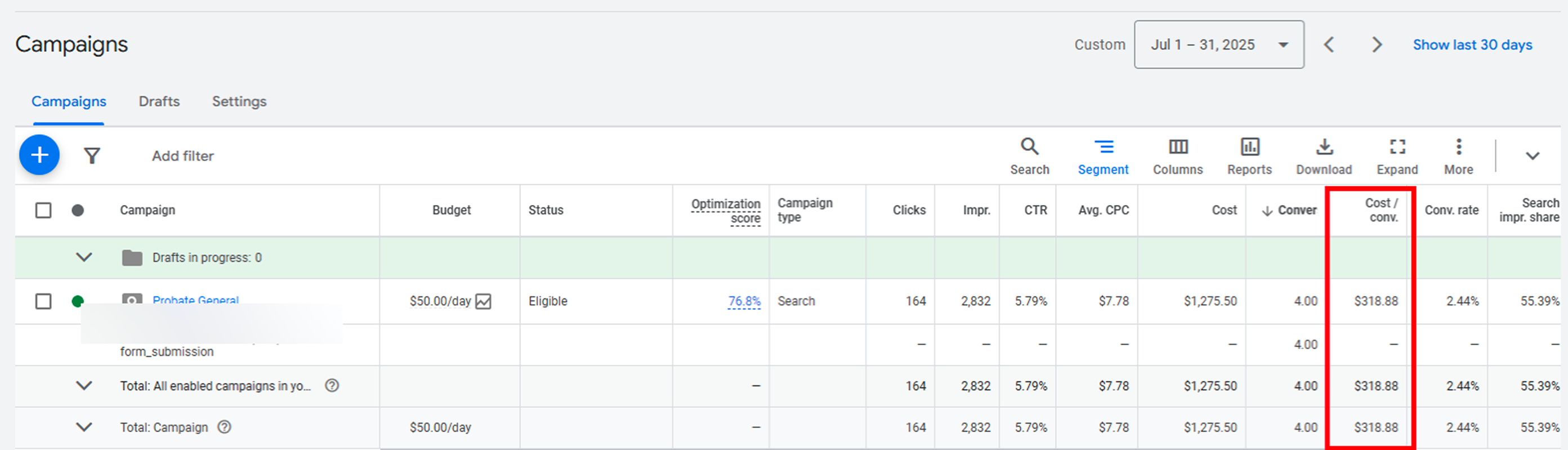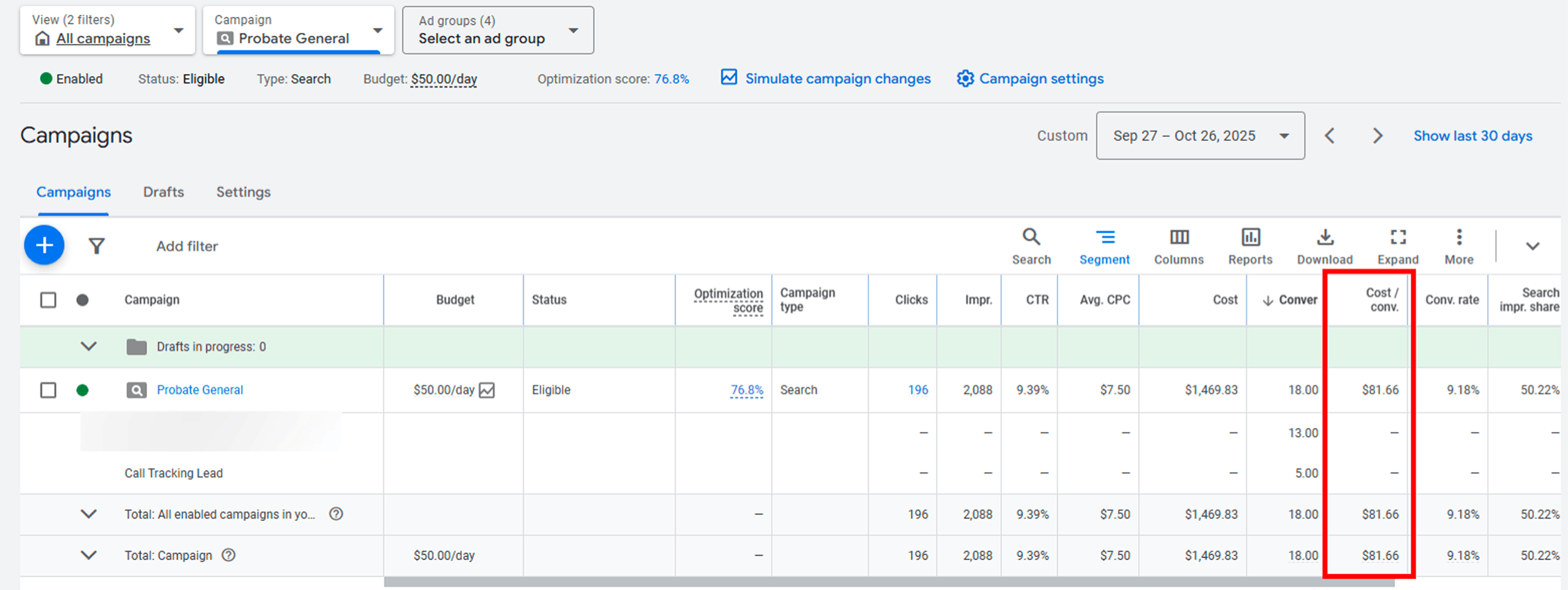 The cost per real conversion initially surged to $300 as only legitimate legal inquiries were counted and call tracking was not yet implemented.