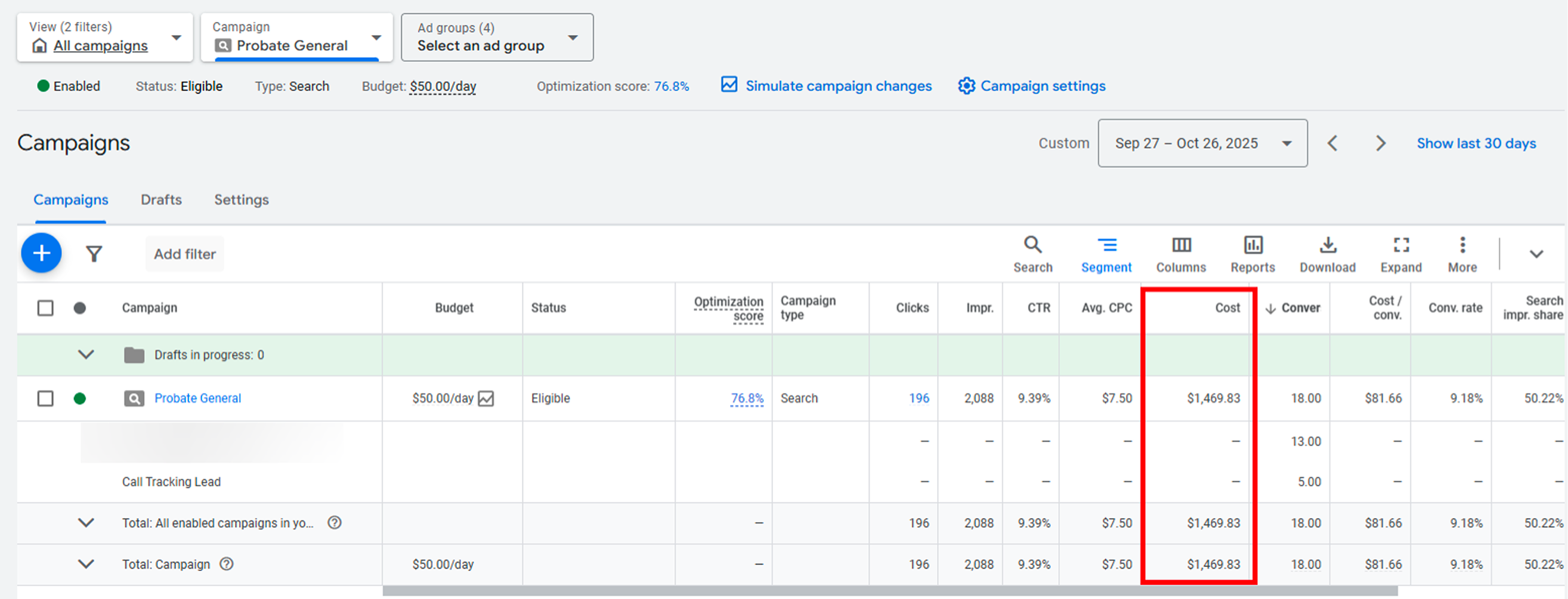 Through persistent optimization—refining keywords, tightening targeting, improving tracking—the cost per lead steadily dropped, reaching just $82 in October 2025.
